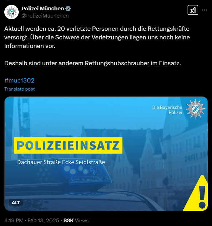म्यूनिख पुलिस ने सोशल प्लेटफॉर्म एक्स पर लिखा है कि ड्राइवर को हिरासत में ले लिया गया है और फिलहाल उससे कोई खतरा नहीं है. आपातकालीन सेवाएं घटनास्थल पर पहुंच गई हैं. जर्मनी के अखबार बिल्ड ने घटना में 15 लोगों के घायल होने की खबर दी है जबकि फोकुस पत्रिका ने यह संख्या 20 बताई है.