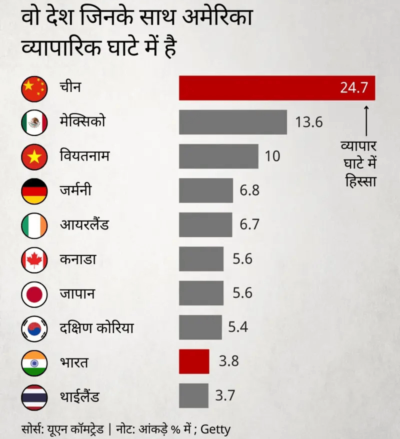 अमेरिका का सबसे ज़्यादा व्यापारिक घाटा चीन के साथ है. अमेरिका के कुल व्यापारिक घाटे में 24.7 फ़ीसदी हिस्सा चीन का है. भारत की अगर बात करें तो यह महज 3.8 फीसदी ही है.